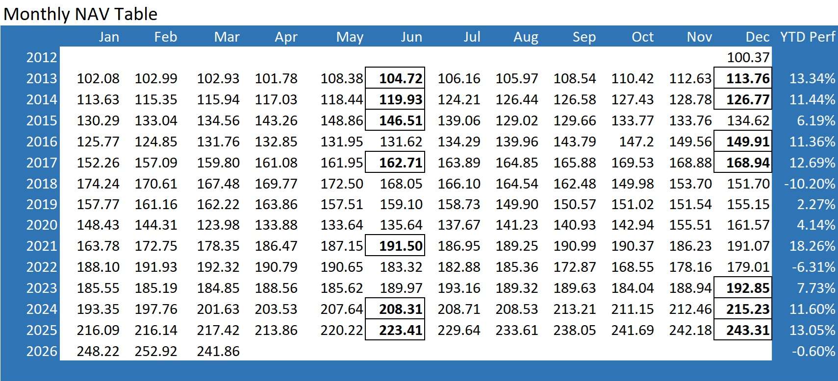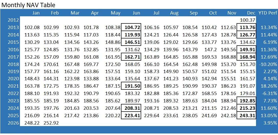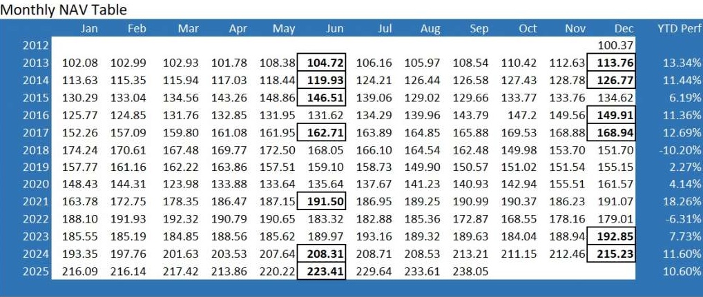 AAM’s portfolio holds nearly 1,000 carefully selected stocks worldwide, far more than the typical fund’s 20–50 holdings. This extensive diversification reduces risk and volatility, providing smoother, more consistent returns that help investors stay confident through all market cycles. Here is our latest Monthly NAV Table: